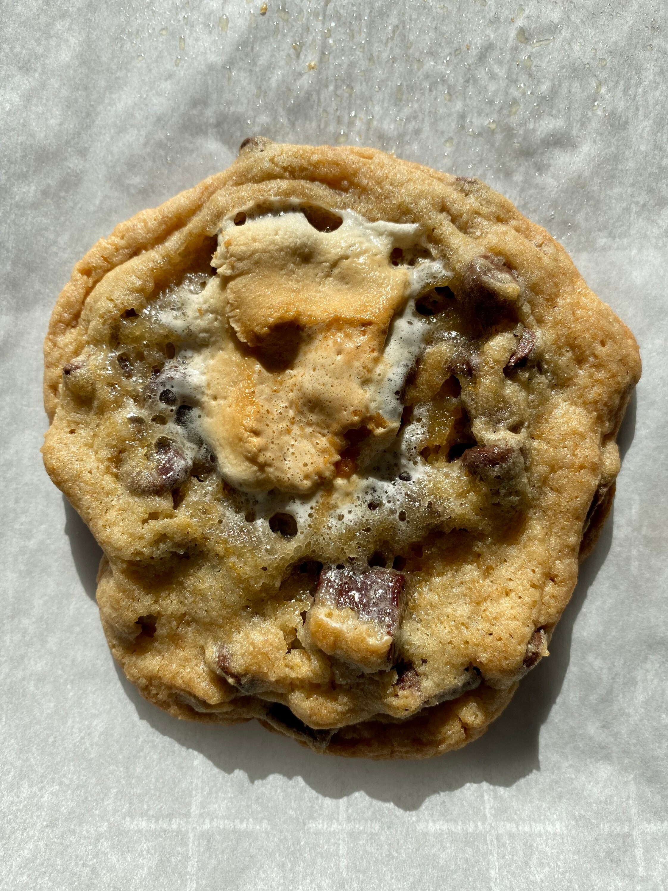 Toasted marshmallows stuffed inside a gooey chocolate chip cookie!